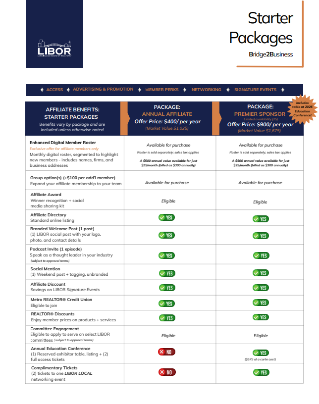 Our revamped affiliate membership is the same price as before - only $400/year! - and offers expanded marketing and advertising perks to boost your visibility. The Annual Affiliate membership is designed for businesses looking to connect with REALTORS® at a low annual cost and cover their affiliate business essentials.